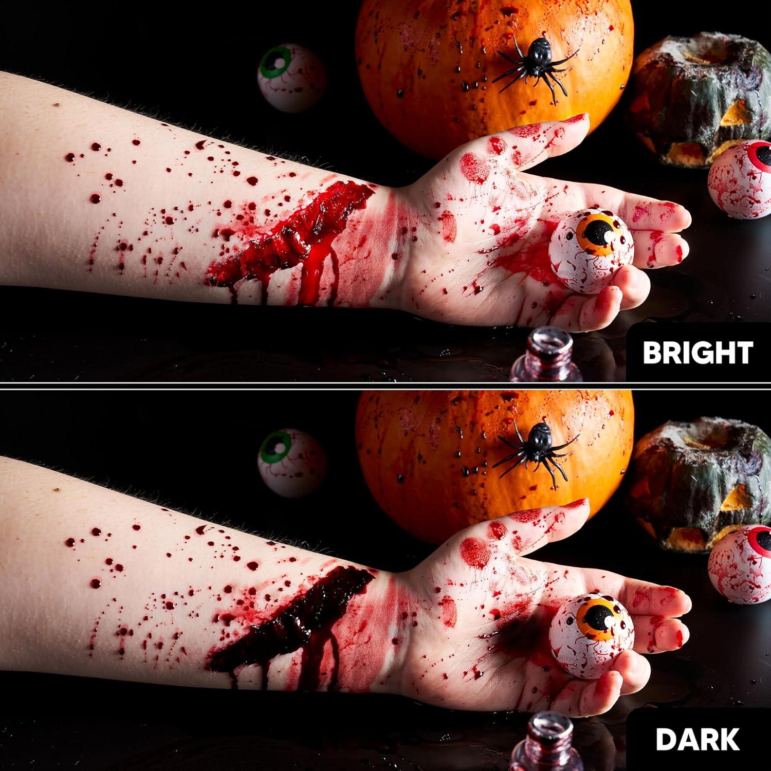 Wide Application. Our Halloween fake blood latex is perfect for various Halloween-inspired looks, such as a vampire, zombie, ghost, or monster, this makeup fake blood adds the perfect finishing touch to your halloween costume. It is also ideal for theatrical performances, film productions, haunted houses, and other creative events.